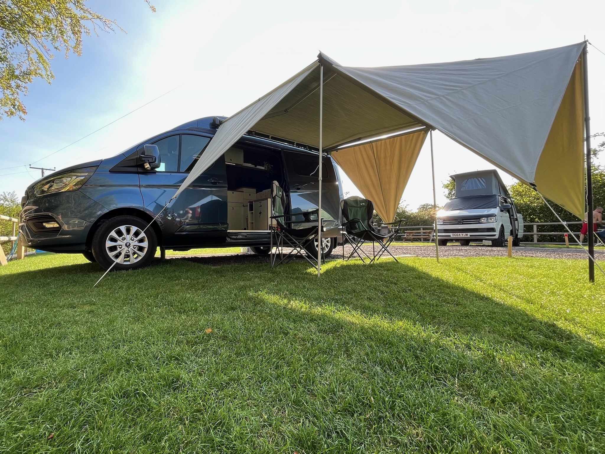 Thule Omistor 5500 awning with 5 x Thule Subsola triangular panels to extend it. Provides masses of adaptable outdoor space.